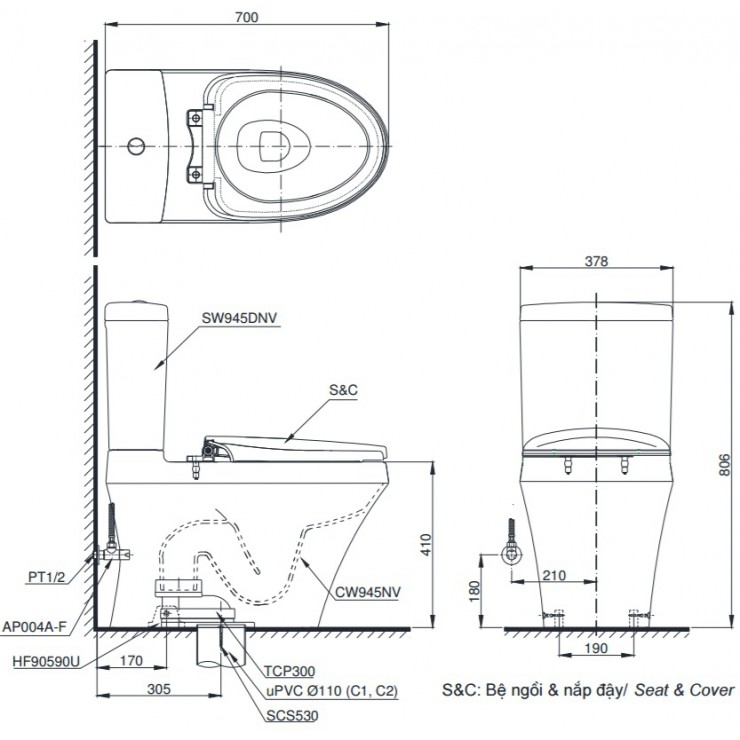 Bản vẽ kỹ thuật bàn cầu TOTO CS945DNT3